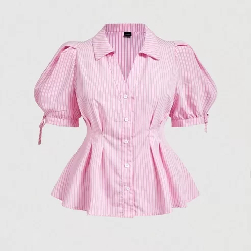 A refined short-sleeve blouse designed with a slimming waistline and graceful puff sleeves, perfect for elevating both office attire and daily looks.
