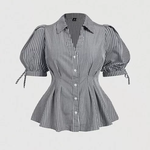 A refined short-sleeve blouse designed with a slimming waistline and graceful puff sleeves, perfect for elevating both office attire and daily looks.