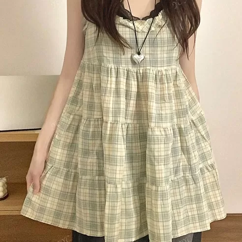 Crafted with a lightweight plaid fabric, this sleeveless top offers a flowy, tiered silhouette for a relaxed yet charming look.