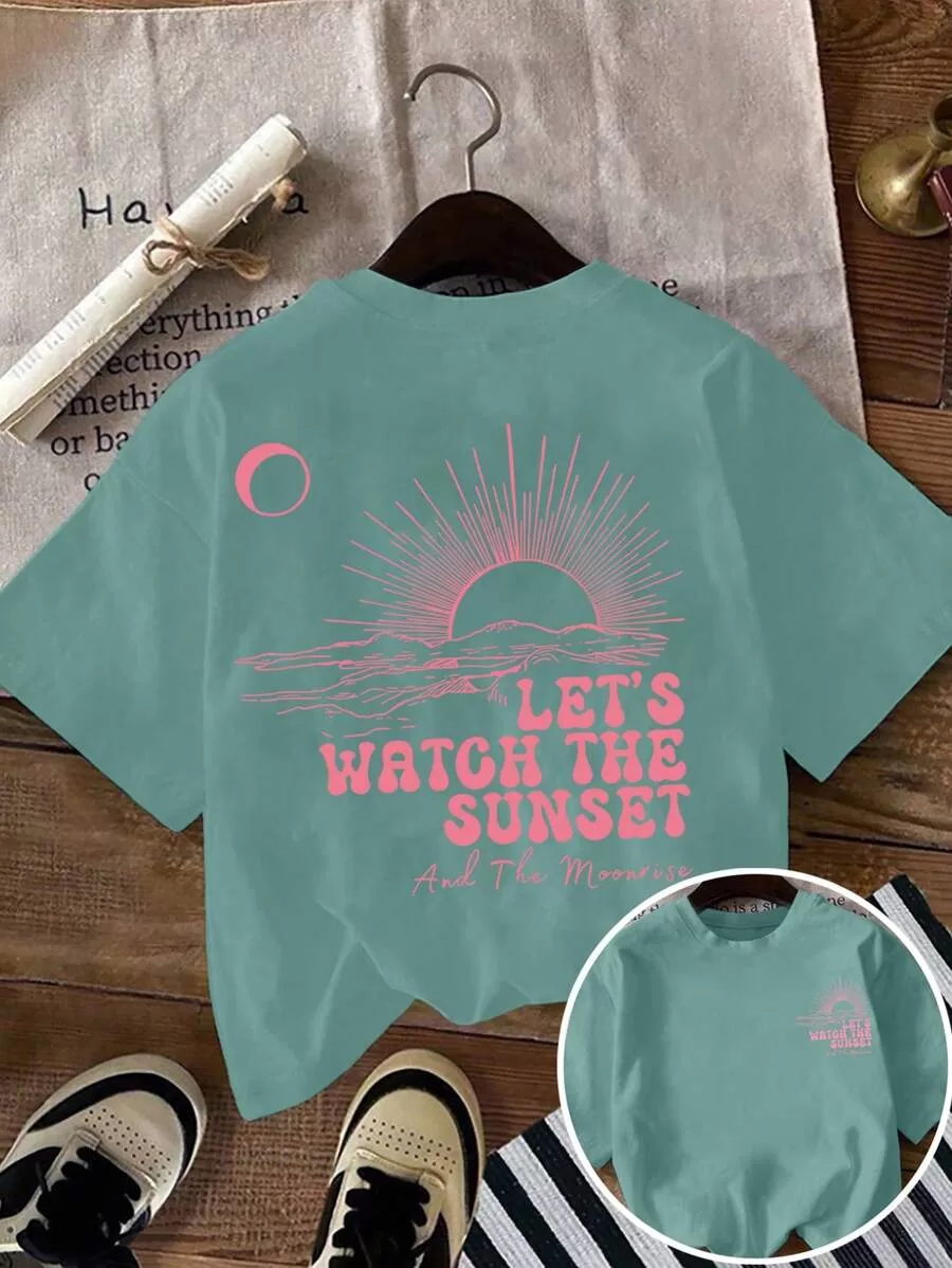 Featuring a poetic sunset and moonrise graphic in a clean line-art style, this round-neck short sleeve tee captures the mood of calm summer evenings.