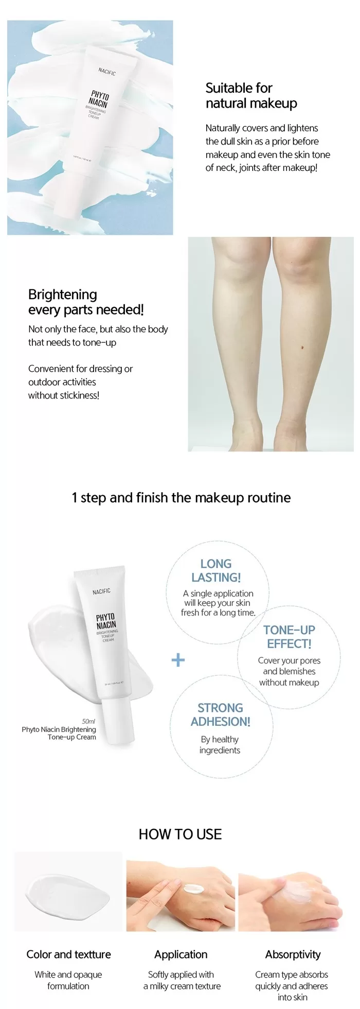 NACIFIC Phyto Niacin Brightening Tone Up Cream effectively covers pores and blemishes while lightening dull skin, suitable for use on the face, neck, and body.