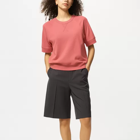 With its raw-edge neckline, ribbed hem, and half sleeves, it combines comfort and casual charm.
