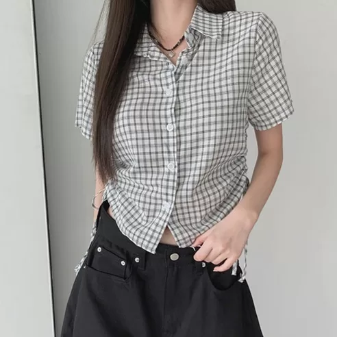 This short-sleeve checkered shirt adds a trendy twist to a classic look with its unique side strap shirring detail.
