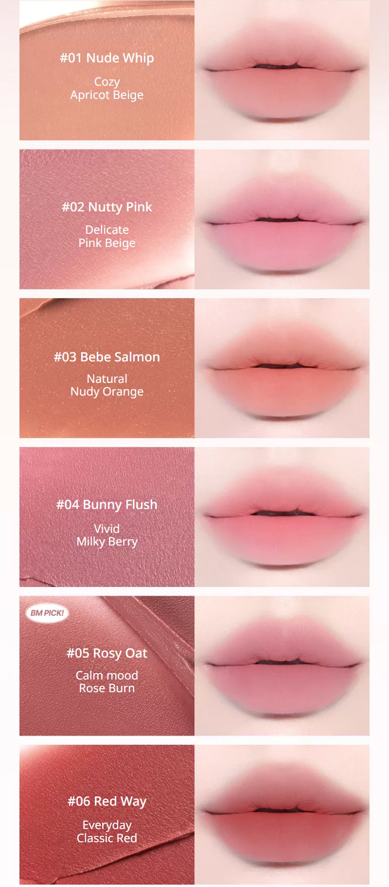 01 Nude Whip, 02 Nutty Pink, 03 Bebe Salmon, 04 Bunny Flush, 05 Rosy Oat, 06 Red Way, 07 Muted Cherry, 08 Rose Breeze, 09 Cool Stain, 10 Crushed Berry, 11 Roasting Fig