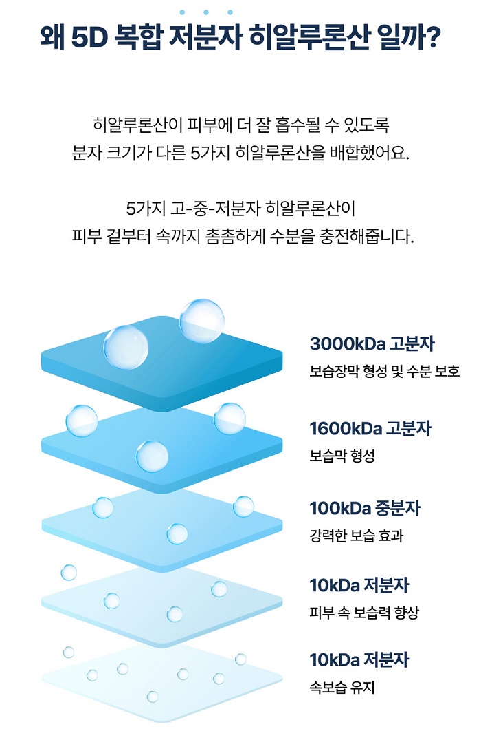5D Complex Low Molecular Hyaluronic Acid: Absorbed well into the skin, hydrating the skin with moisture from the outside to the inside.