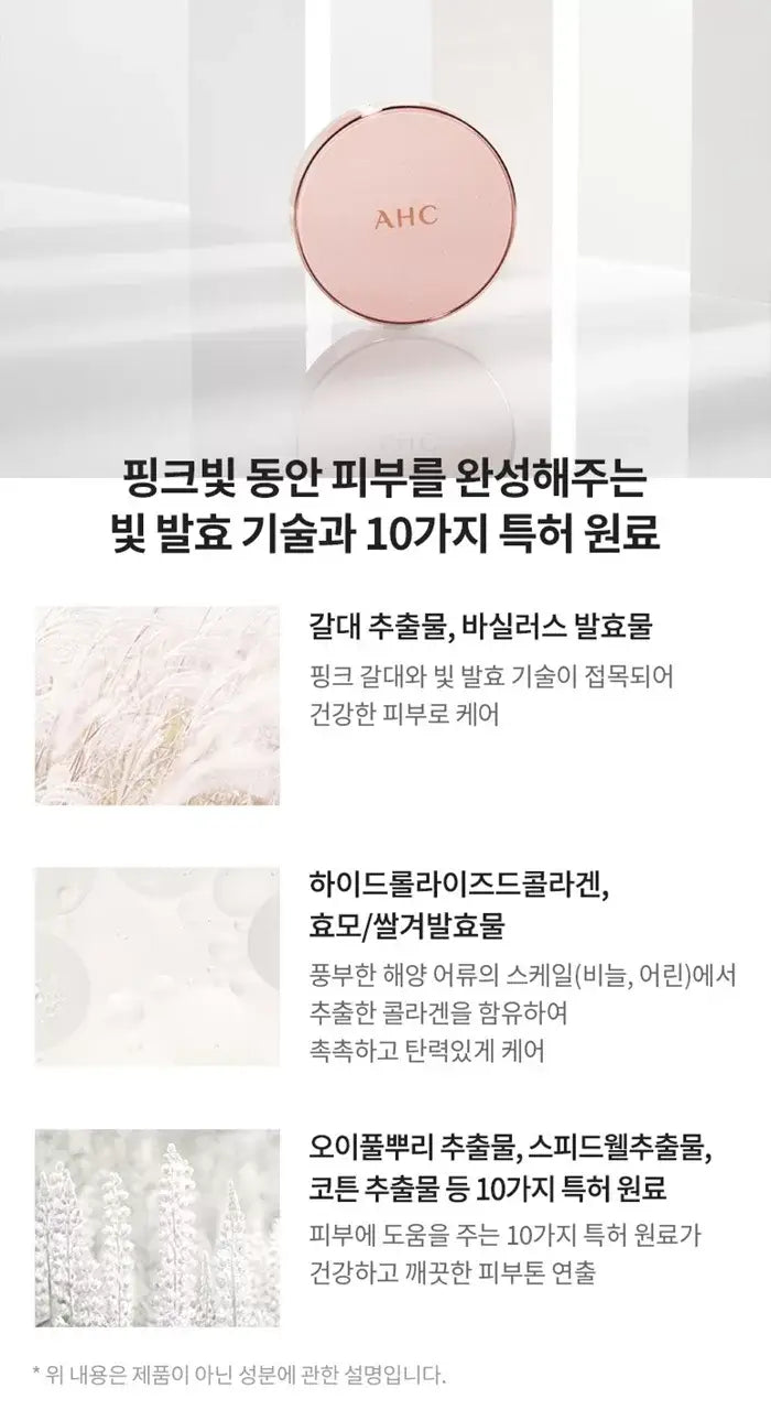 Enhance your radiance with a vibrant pink glow! The AHC Aura Secret Toneup Cushion combines pink-brightening ingredients with AHC's exclusive Light Fermentation Technology to create a more luminous and youthful complexion. Hydrate and firm your skin effortlessly! This cushion forms a Moisture Melting Hydration Barrier, delivering both moisture and nourishment for a dewy, plump finish. Infused with Collagen Water Complex, it helps maintain skin elasticity. Flawlessly smooth coverage! The cushion contains porous powder that effectively conceals skin imperfections, leaving a flawless and refined texture.