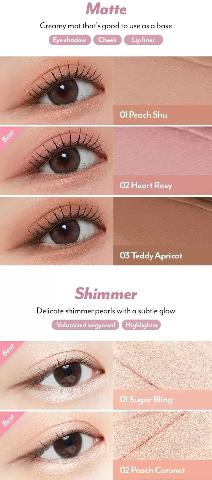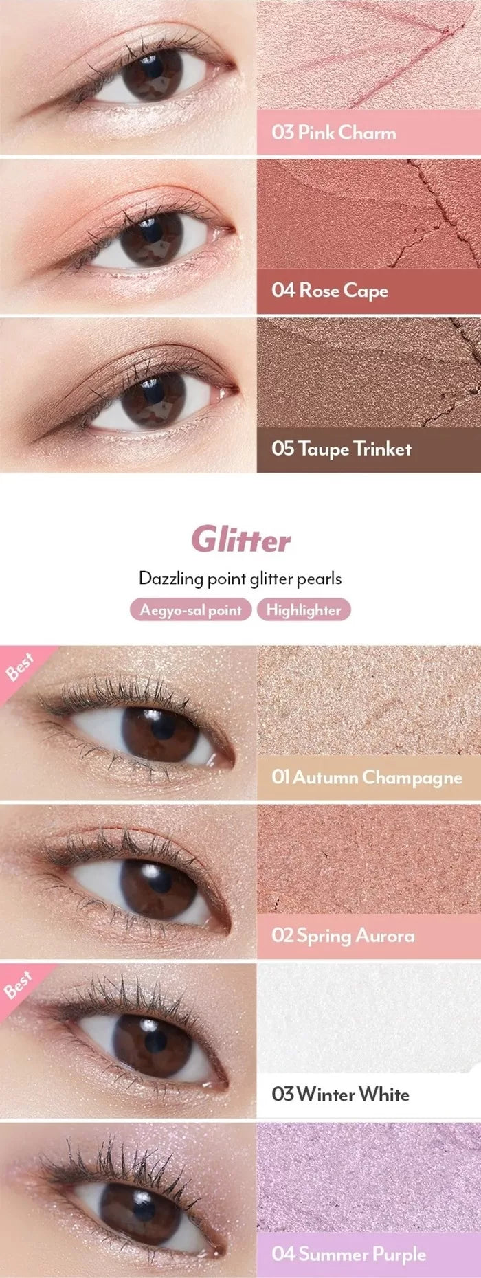 - Under Eye Shadow: For larger sclera and smaller pupils – Shimmer 004, 005